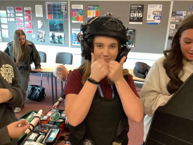 The sessions were highly interactive, with students asking a wide range of questions and engaging fully throughout. Mike also brought a selection of specialist equipment, giving students the opportunity to examine and try on items used in the field.